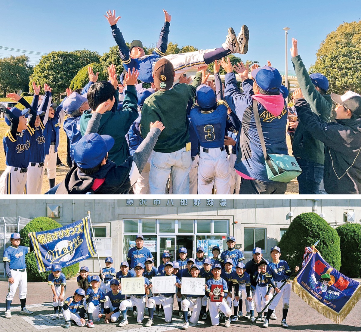 第53回関東団地少年野球神奈川支部秋季大会の本大会(6年生以下)決勝戦が9日、八部野球場で行われ、明治オリオンズが善行リトルエンゼルスを10対0で退けて優勝した。10年間チームの指揮を執り、年内をもって勇退する宇都宮政広監督(52)を胴上げした。