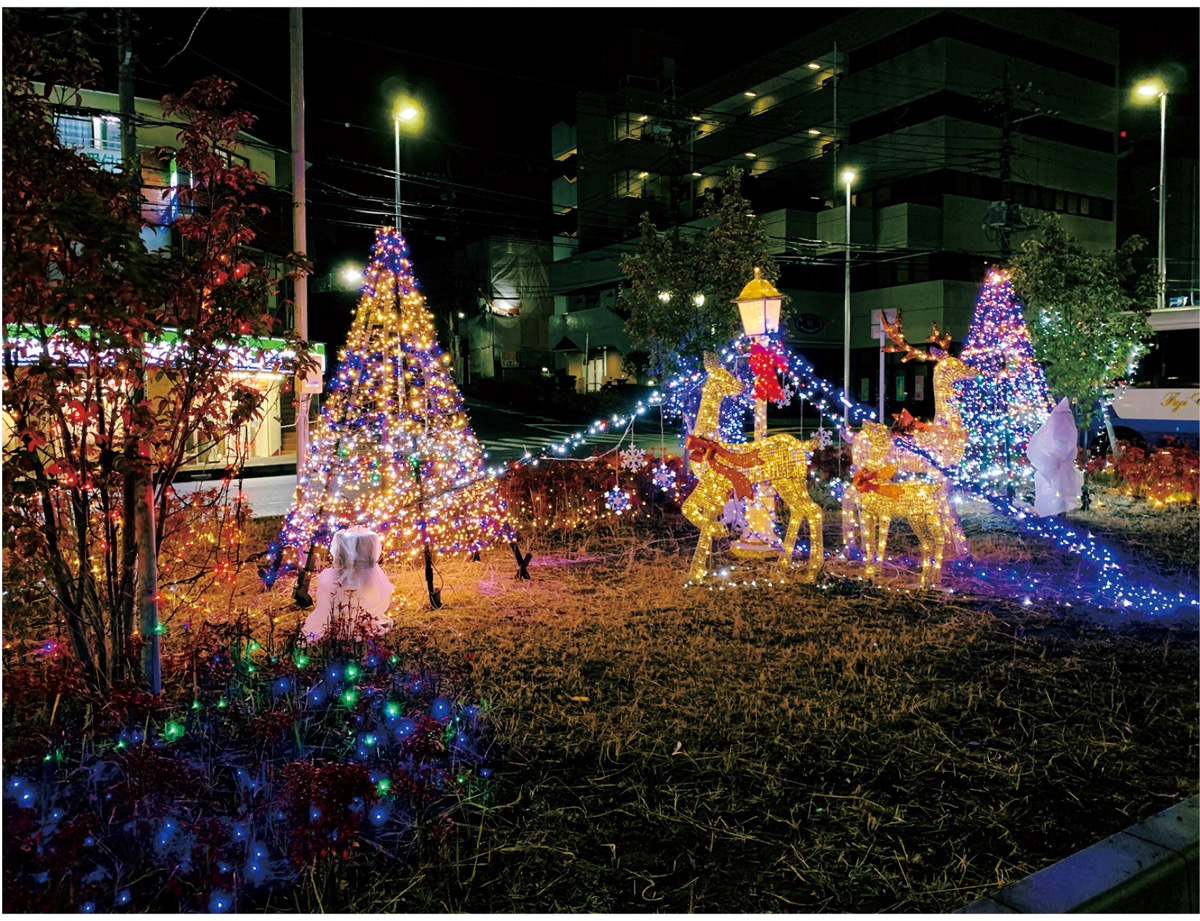 小田急線善行駅前で恒例のイルミネーション点灯が夜に彩りを添えている=写真。善行青年会の主催。