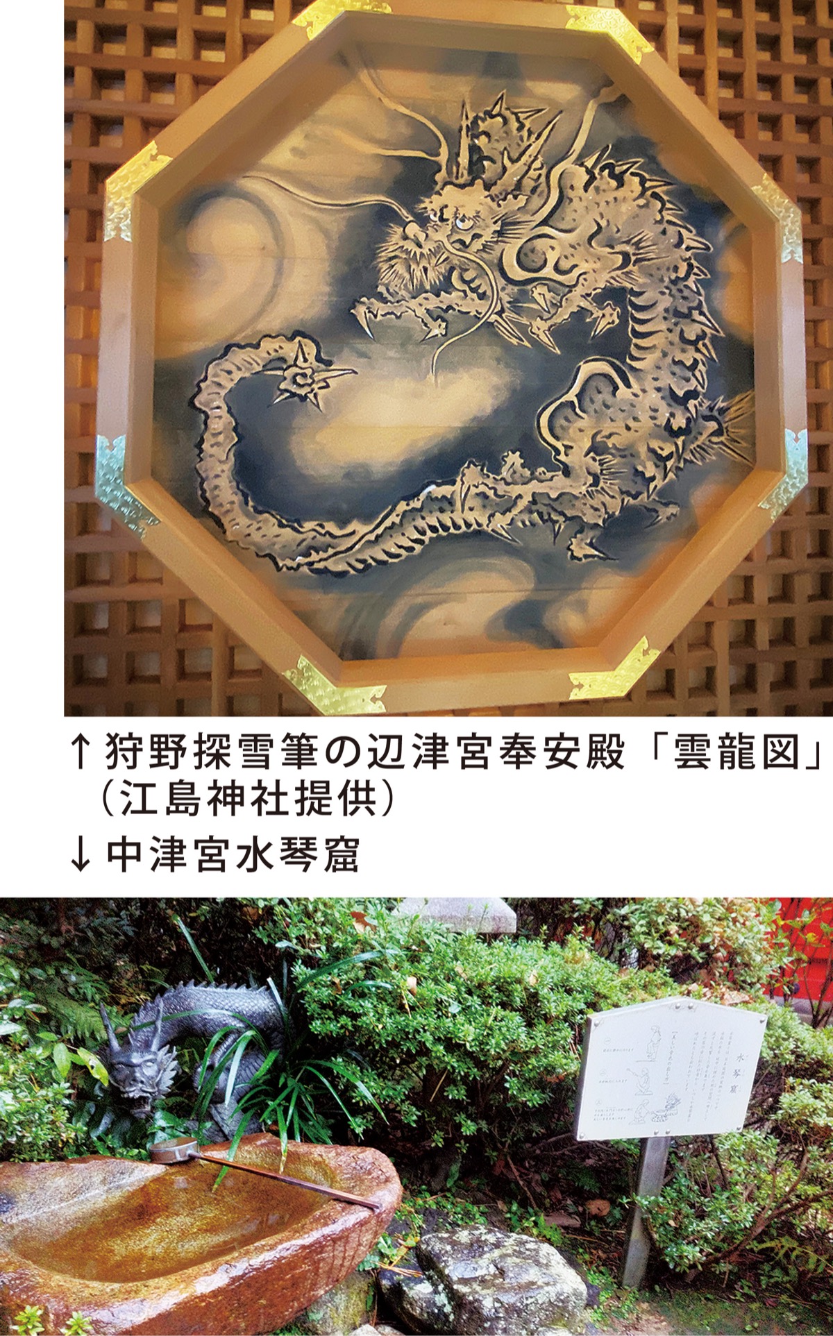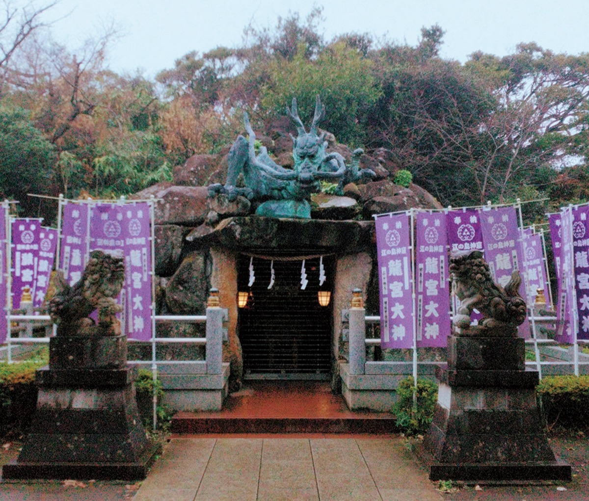 信仰の発祥の地である岩屋には現在、1993年の公開以降に設置された龍神像がある。「神社としては同年、崇敬者の篤志によって岩屋洞窟の真上にある奥津宮に龍宮(わだつみのみや)を建立した。境内では最奥にあるスポット。辰年の今年はぜひ龍を探して島内を歩き、最終地点として参詣してみては」