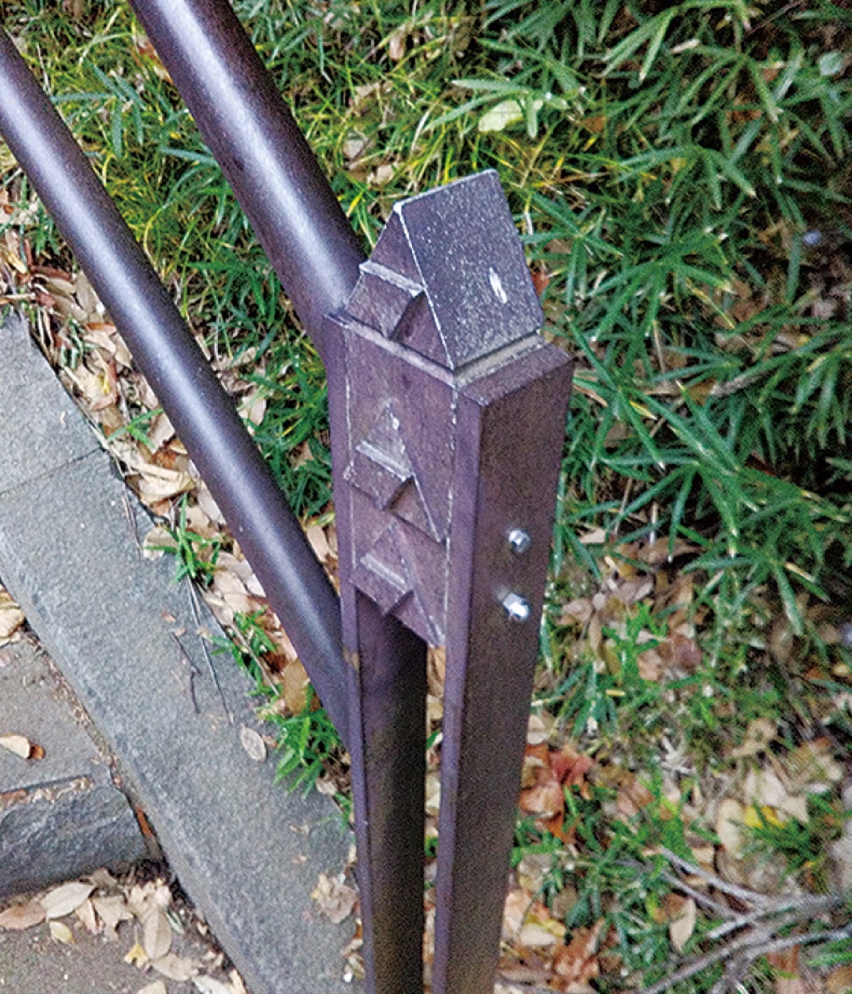 「道や階段にも龍がいる」と堀嵜さん。「ポールや手すりについている『三つ鱗』は体表のこと。鎌倉幕府の最高権力・北条氏の家紋でもある」と説明する。