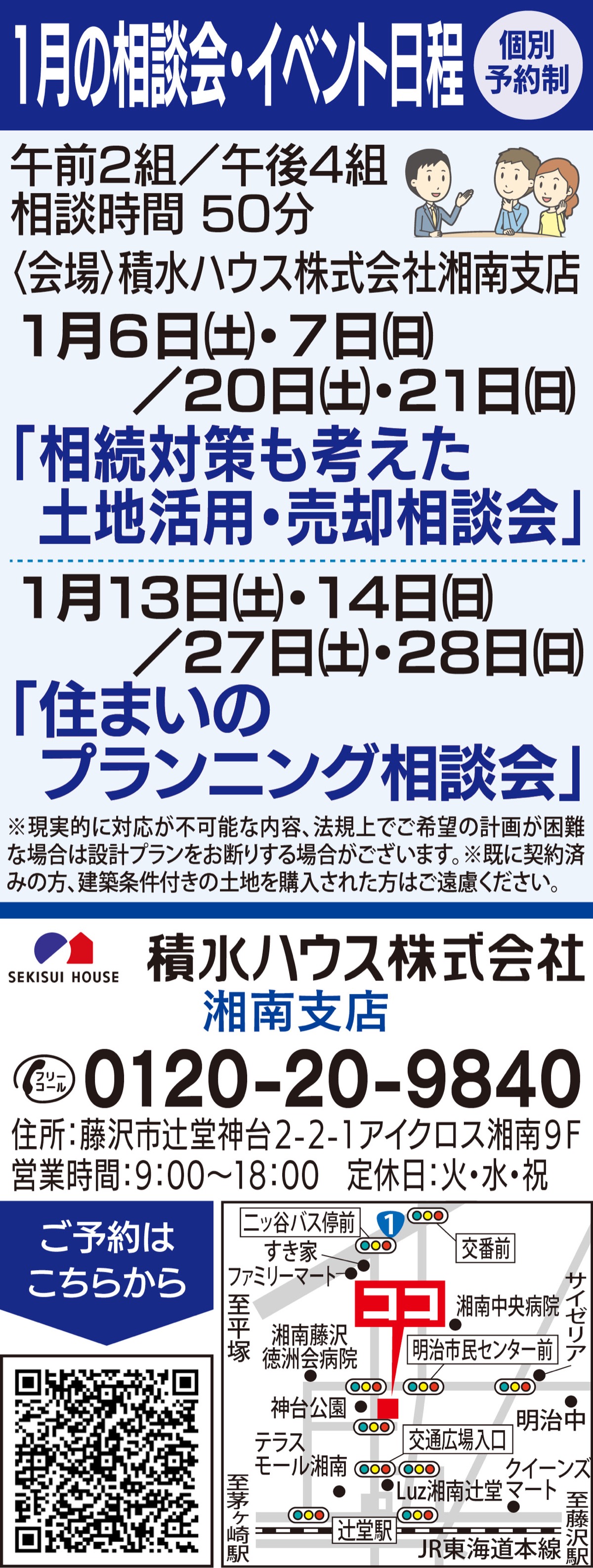 1月6日(土)・7日(日)と1月20日(土)・21日(日)は「相続対策も考えた土地活用・売却相談会」を開催。「所有する土地をどうしたらいいかわからない」や「相続対策で土地を売りたい」など、土地活用や売却のアドバイスを行う。