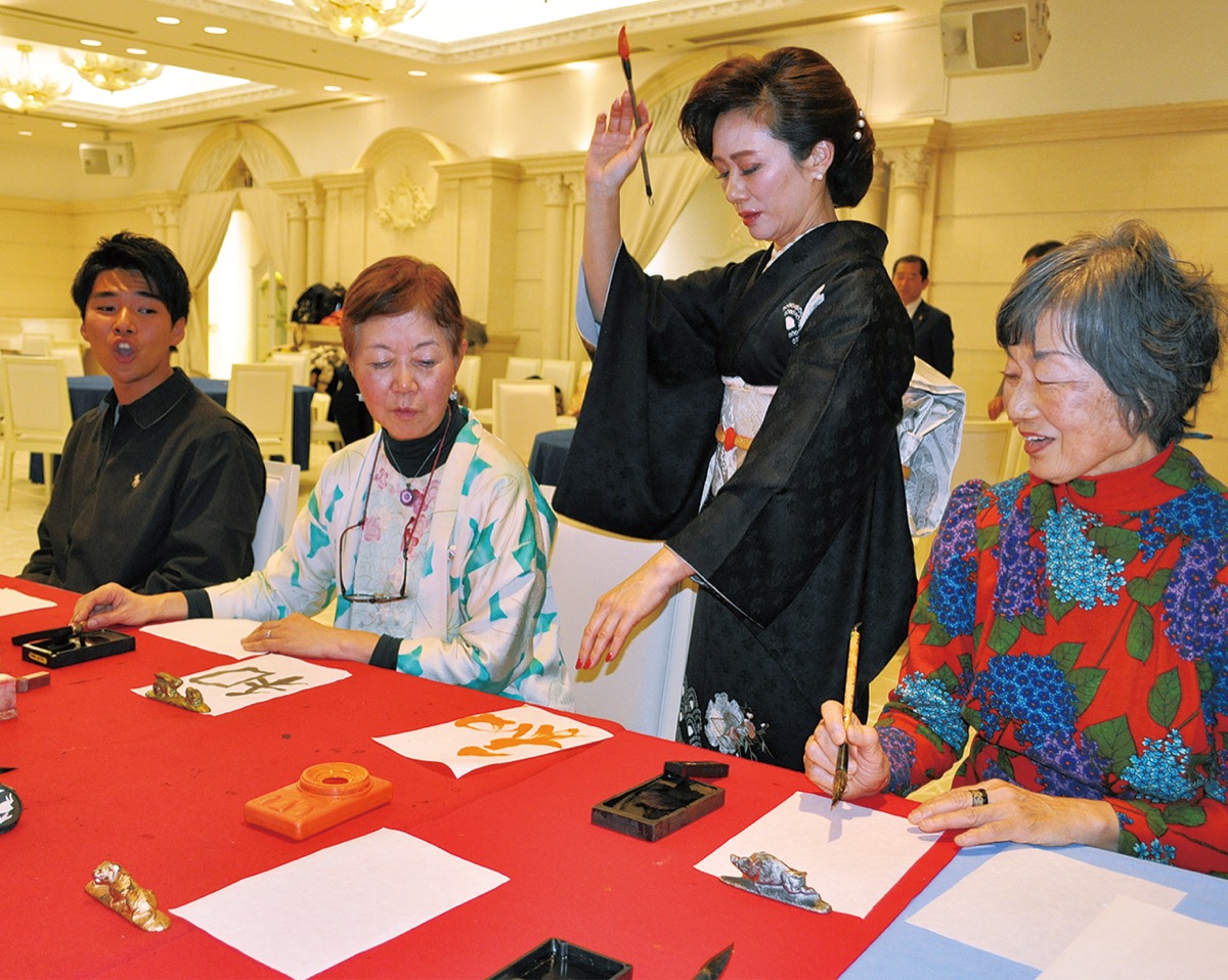 初日の19日に湘南鎌倉クリスタルホテルで茶道と華道、書道の体験会があり、参加者は各分野の達人から手ほどきを受けた。書道では、講師の手本を真似て「桜」「義」「昇」などの好きな字を半紙に練習。本番で色紙に墨書し、講師の筆で名前を書き添えてもらった女性は「家宝にします」と笑顔を見せた。一行は夕食で寿司と日本酒とともに邦楽演奏を楽しみ、日本酒のレクチャーも受講。2日目は江ノ電沿線を観光した。