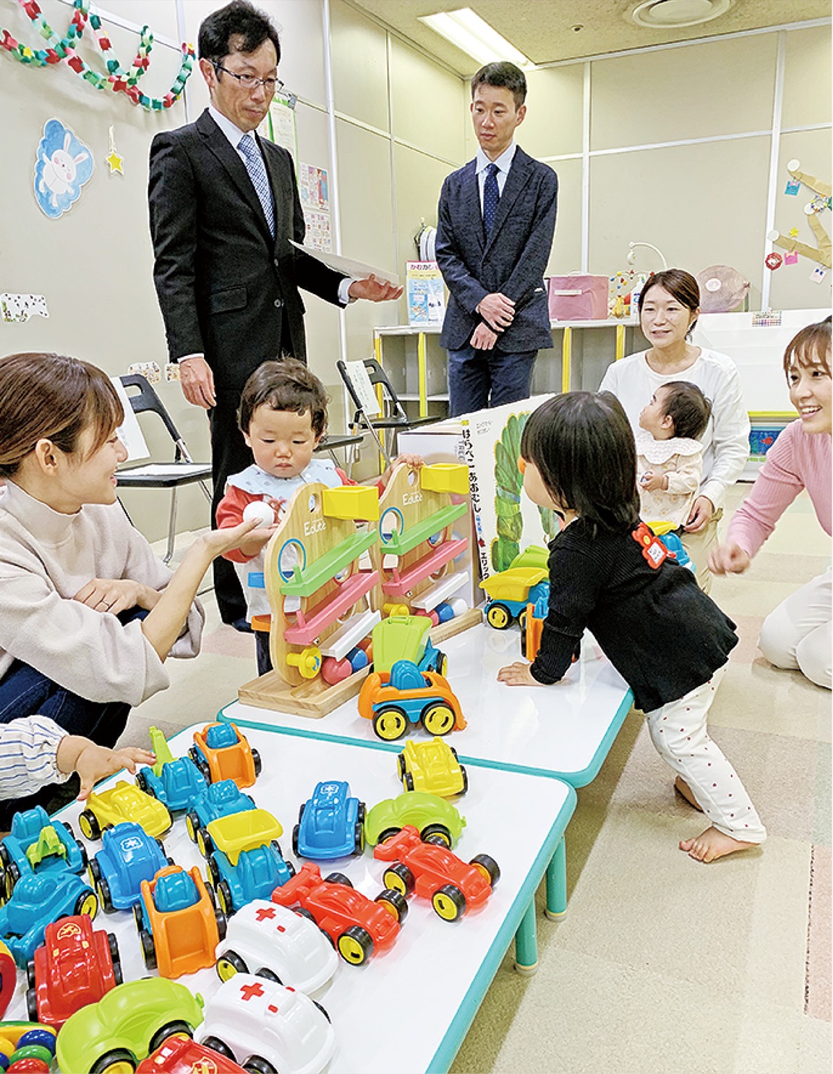 今回は大型絵本や卓上に置ける木製スロープなど7種類のおもちゃを用意。同社の松村泰幸総務室長は「次世代を担う子どもたちに役立ててもらえれば」、鈴木恒夫市長は「毎年市の子育て支援をいただきありがたい」と謝辞を述べた。
