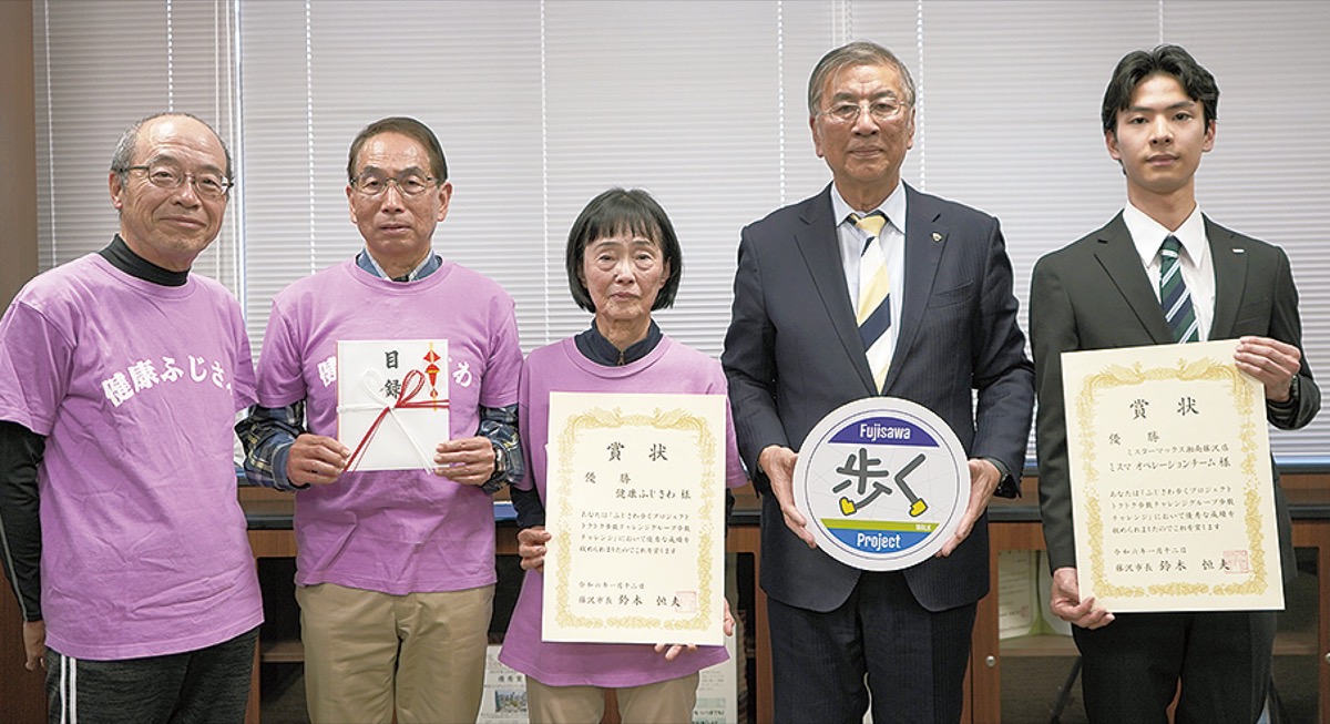 藤沢市の健康づくり事業「ふじさわ歩くプロジェクト」で、市内事業所や団体が平均歩数を競う「第3回トクトク歩数チャレンジグループ歩数チャレンジ」が開催され、事業所の部はミスターマックス湘南藤沢ショッピングセンター(辻堂)の「ミスマオペレーションチーム」、任意団体の部は「健康ふじさわ」が優勝した。12日、両者に鈴木恒夫市長から表彰状が贈られた=写真。