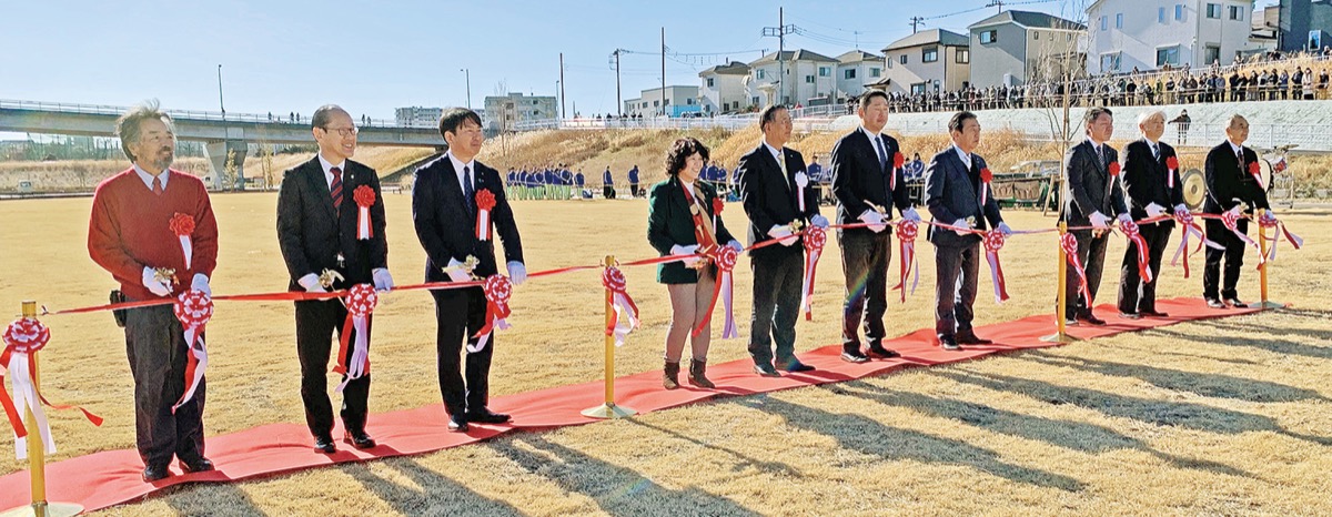 藤沢市の中央部を南北に流れる引地川が大雨などで氾濫した際、遊水地機能を果たす下土棚遊水地公園(下土棚)が14日、開園した。治水対策の一環として県が2006年から整備を進めてきたもので、平時は市民が利用できる都市公園として活用する。同日に開園式が開かれ、市や地元自治会関係者など約40人が出席。新たな憩いの場の完成を祝った。