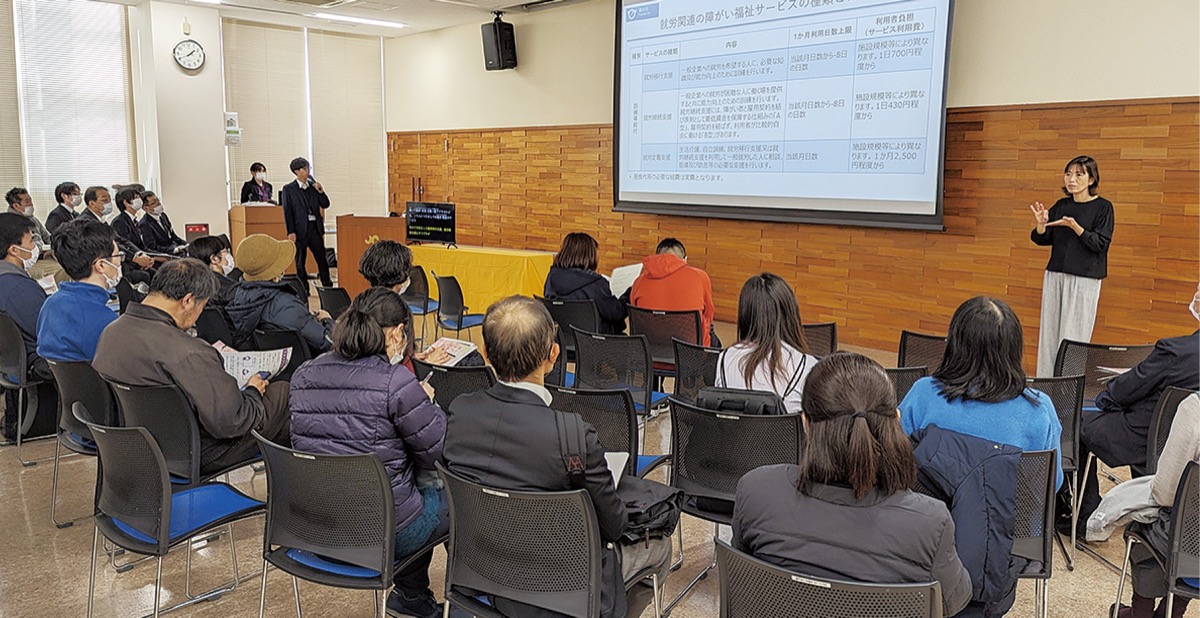 当日は市内の就労支援を行う40事業所の紹介・相談ブースや、作業所の商品を紹介する物販ブース、公的支援や就労援助、障害者雇用の助成などの制度説明ステージを設置。当事者、保護者から、雇用や仕事を依頼したい事業者まで様々な立場の人たちに向けてワンストップで情報が得られる形で実施した。