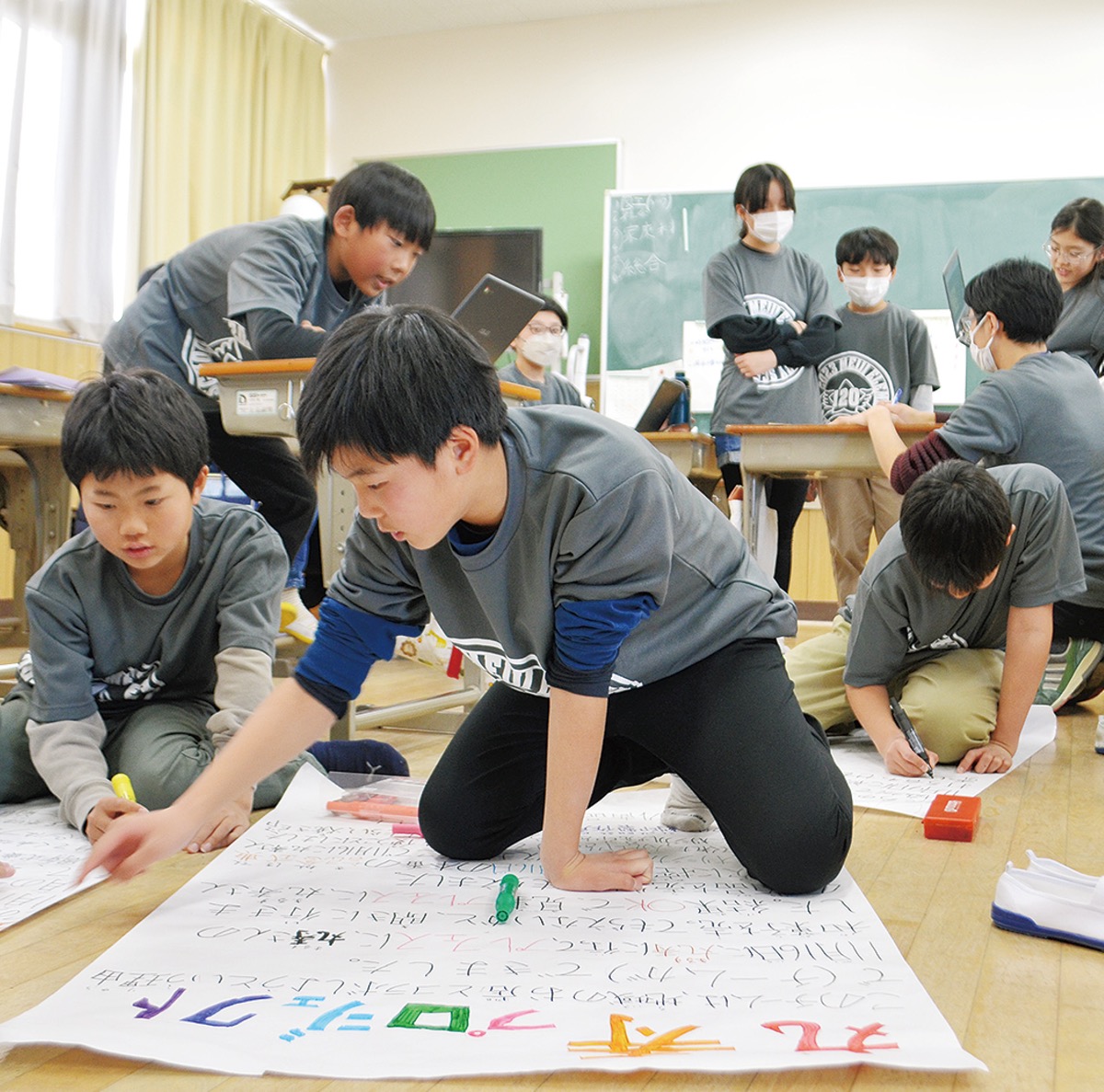 「ここは何色が良いかな」。先月30日、教室内には児童の真剣な声が響く。式典では同校を紹介する掲示や映像、ミニチュアの旧校舎展示などが予定され、2つの制作チームが作業を進めていた。この他にも、地域店舗と協力したコラボ商品を担当する「企画営業」や、校外への宣伝活動や費用を管理する「広報・会計」など、さながら小さな会社のようだ。