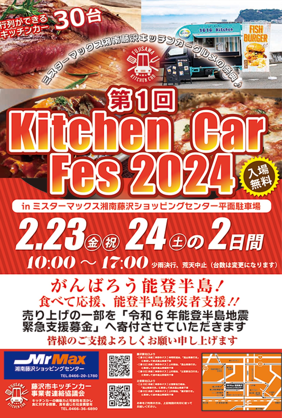 2月23日(祝)と24日(土)、辻堂新町の大型商業施設「ミスターマックス湘南藤沢ショッピングセンター」で約30台が並ぶ「Kitchen Car Fes 2024」が初開催される。能登半島地震の被災地支援が目的で売上の一部を寄付する。