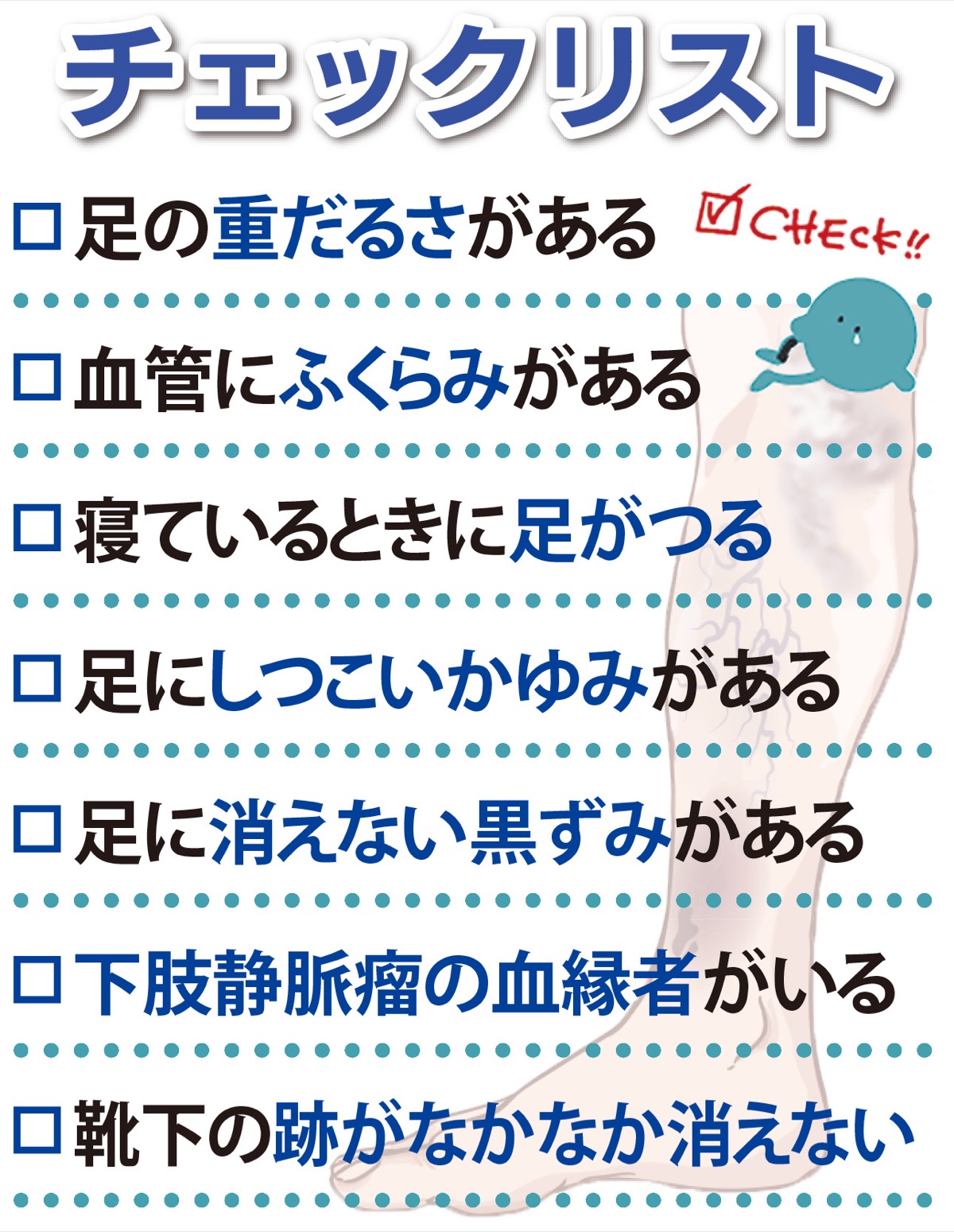 足のむくみや重だるさ、血管のぽこぽことしたふくらみが気になるなら『下肢静脈瘤(かしじょうみゃくりゅう)』の疑いが。静脈の弁が壊れて血液が逆流し、さまざまな影響を及ぼす疾患で、30代以上の2人に1人が発症すると言われている。進行することでかゆみや色素沈着、悪化すると皮膚に穴が開き、潰瘍(かいよう)となることも。立ち仕事、加齢、遺伝、妊娠・出産などの要因がある。