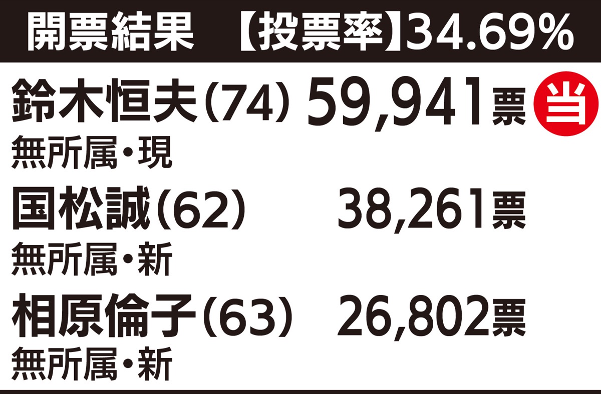 任期満了に伴う藤沢市長選が18日、投開票され、無所属で現職の鈴木恒夫氏(74)が4選を果たし、いずれも新人で無所属の国松誠氏(62)、相原倫子氏(63)を破った。投票率は前回比5・42ポイント増の34・69%で、12年ぶりに30%台に回復した。