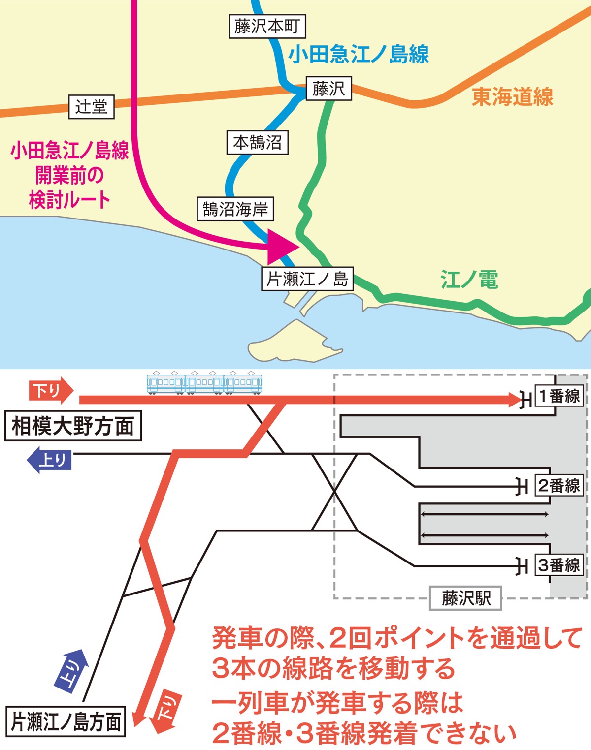 一見、藤沢駅は電車が折り返して発着する終着駅だが、相模大野から藤沢駅に到着後、先頭と最後尾の車両を入れ替えて片瀬江ノ島駅に向かうスイッチバック式だ。同電鉄では唯一で、規模としては日本最大級という。