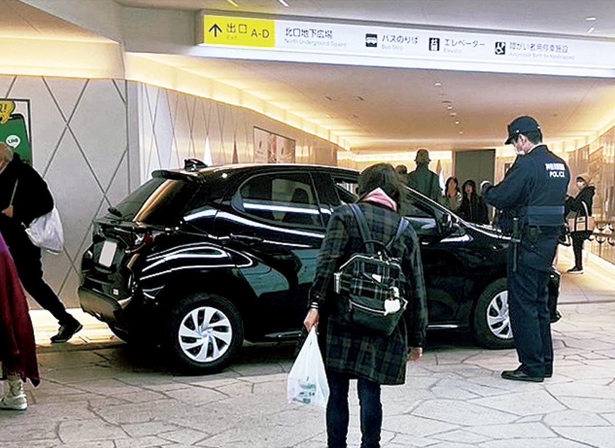 15日正午頃、藤沢駅南口で歩行者用の地下道(延長約90m、幅約7m)に乗用車が誤って進入した=写真。買い物客などで往来が多い時間帯で、一時現場が騒然となった。藤沢警察署によると、けが人はいなかった。