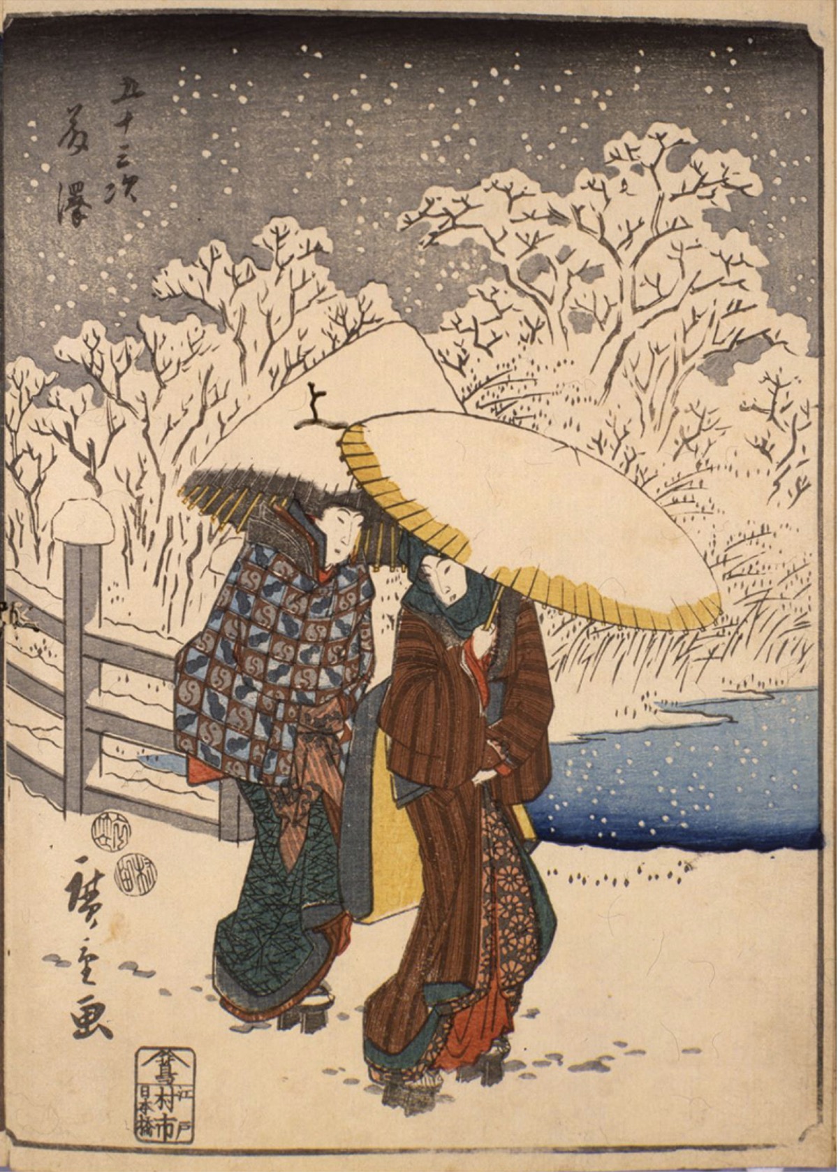 辻堂神台の藤澤浮世絵館で3月5日(火)から企画展「広重の人物東海道にみる季節 藤沢に雪がふる」が開催される。5月6日(月)まで。