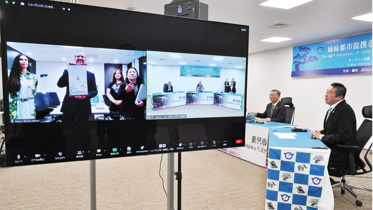 藤沢市と米国マイアミビーチ市の姉妹都市提携65周年を記念し、両市の市長らが5日、オンラインで会談を行った。藤沢市から鈴木恒夫市長と桜井直人市議会議長、市都市親善委員会の増田隆之会長が出席。マイアミビーチ市のスティーブン・マイナー市長らと画面越しにあいさつし、今後も交流を促進していくことで合意した。