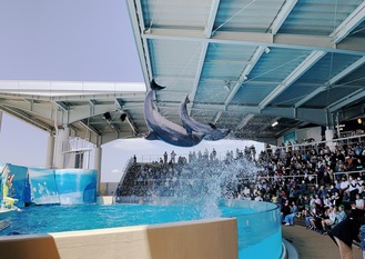 「イルカショースタジアム、再開しました」。初回のショーで飼育員の男性が高らかに宣言した。