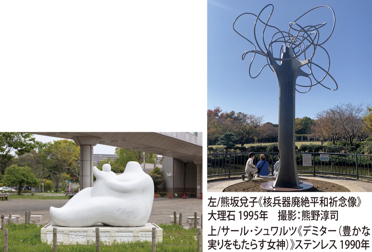 「市民会館や公園で2人の作品を目にした人は多いのでは」と同施設学芸員の鎌田さつきさん。夫妻はパブリックアートも手掛けてきた。奥田公園前広場にある白い大理石の「核兵器廃絶平和祈念像」(平和の母子像)は、戦後50年の節目に熊坂さんが制作したものだ。江の島や大庭城址公園などでも熊坂さんの彫刻を見ることができる。長久保公園にはシュワルツさんの高さ約5mに及ぶステンレス製の作品が建っている。