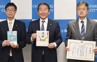 • 寄贈式の様子。佐藤 光茅ヶ崎市長 (中央)と同法人会茅ヶ崎南・北東支部担当副会長 澤邑重夫氏(左)、茅ヶ崎北西支部担当副会長 和田幸男氏