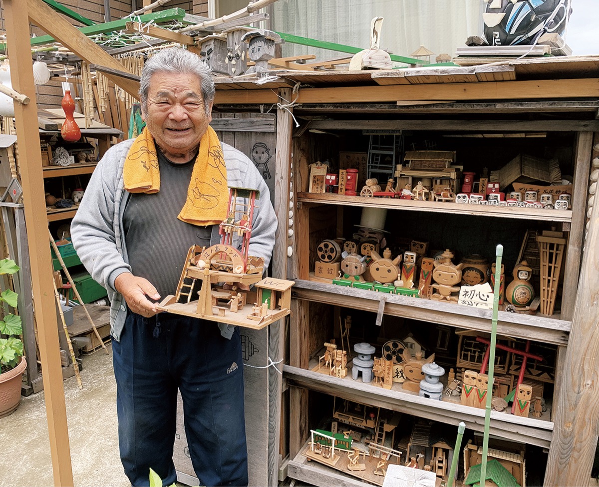 江ノ電に古民家、郵便ポスト、市公式マスコットキャラクターのふじキュン。個人宅のガレージに所狭しと木製の作品がずらりと並ぶ。片瀬海岸在住の飯森弘さん(77)宅だ。そのどれもが、素朴で味わい深い。