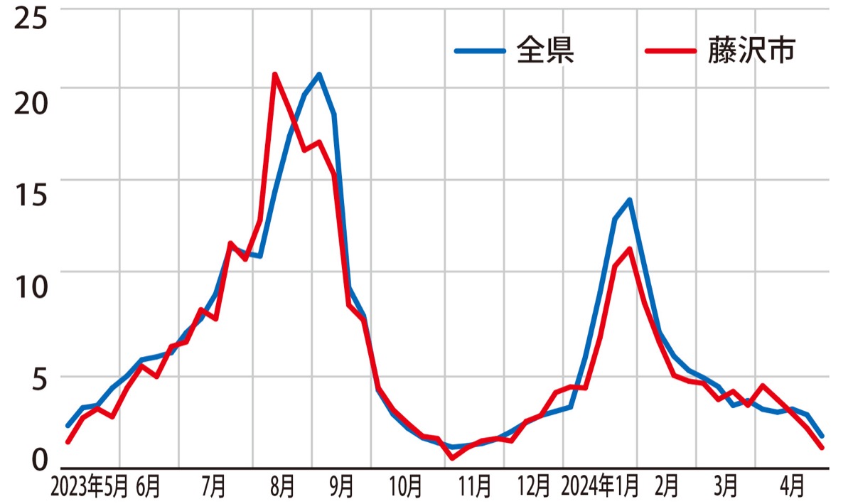 市保健予防課によると、市内では16の医療機関で週ごとの定点把握を実施。1医療機関あたりの平均報告件数は2023年第19週(5月8日〜)が1・44だったが、その後増加が続きピーク時の第33週(8月14日〜)は21・44と14倍超に達した。11月には一時0・56に落ち着いたものの、その後再び増加傾向に転じ、2024年第5週(1月29日〜)には11・94に増えた。県の感染動向も同様の傾向を辿っており、第9、10波の流行とみられる。