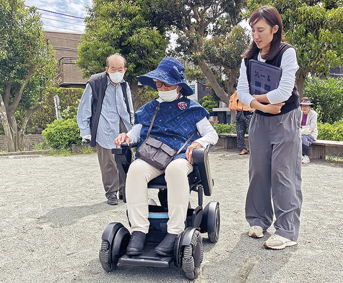 片瀬山は坂道が多い地形で、電動車いすの有効性を感じてもらうため会場に選ばれた。この日は近隣の住民ら15人が参加。段差に強く、旋回性能が高い最新型の電動車いすなどがあり、乗り心地や速度、旧型との比較を体験した。参加した90代の女性は「歩くよりも楽で便利。歩道の段差が少なくなるなど、道路づくりも配慮されたらなお良いと思う」と感想を話した。