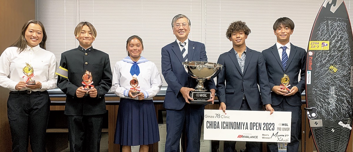 表敬訪問したのは「ワールドサーフリーグ(WSL)」で2023プロジュニアアジアランキングで1位に輝いた矢作紋乃丞選手(21)ら。菅谷帆那選手(21)と加計正成選手(19)は4月中旬に高知県で開かれた国内選手権の部門別で優勝、伊波優月選手(13)は3位、藤原大さん(13)は4位の成績を収めた。