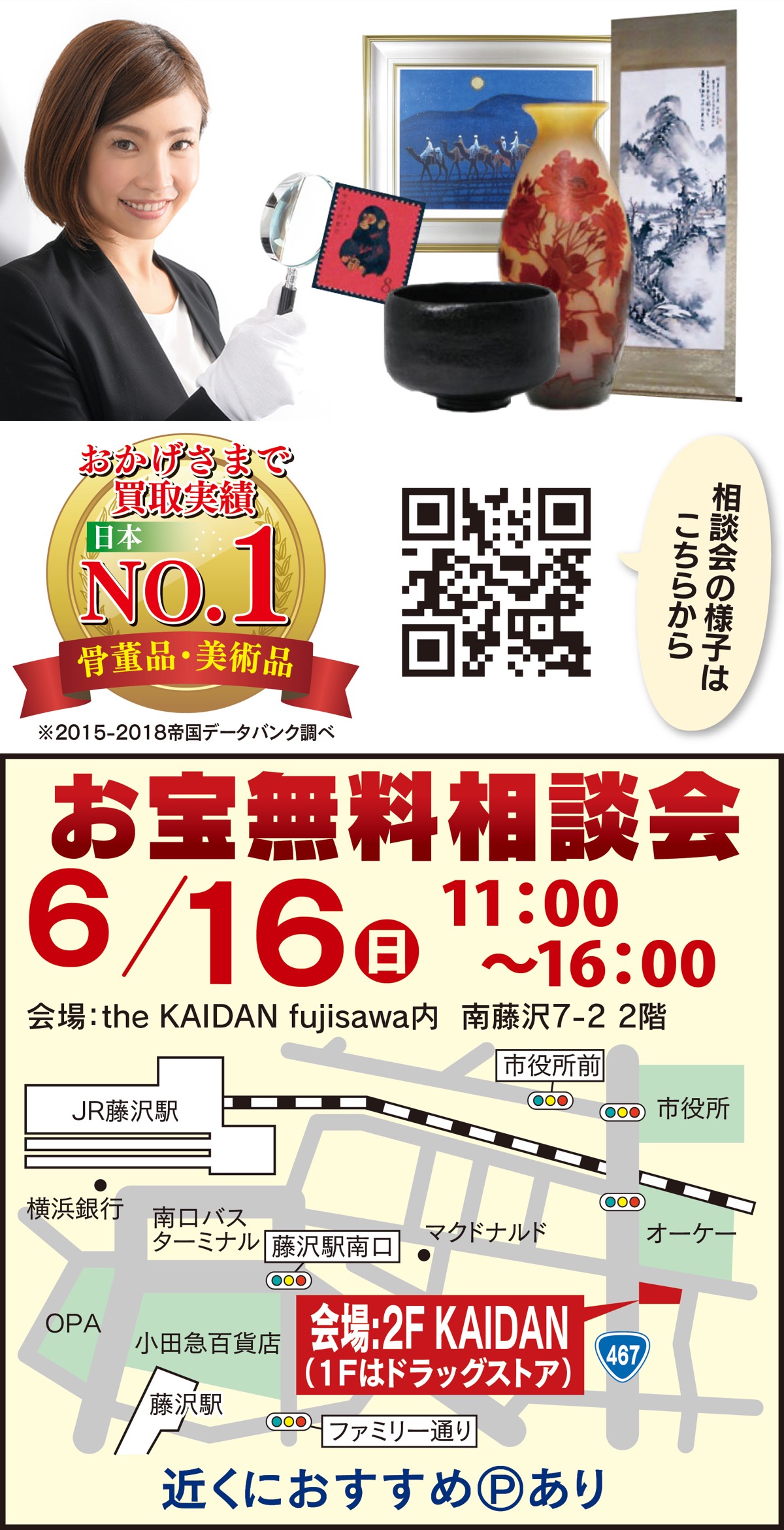 本郷美術骨董館・湘南藤沢支店は6月16日(日)、「お宝無料相談会」を開催する。同店は東大赤門前で創業40年になる美術品や骨董品の専門店。経験豊富な各分野の鑑定士が27人も在籍し、様々な提案を行う。現代アート、絵画、茶道具、古美術品等あらゆるジャンルに対応できるのも魅力。TVや新聞、雑誌にも数多くとりあげられている。特に中国美術の買取りを強化中。「日程の合わない方は、出張査定も大歓迎です」と乾店長は話す。