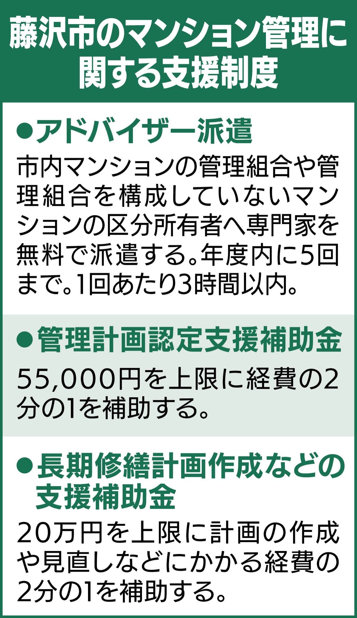 建物の老朽化と、居住者の高齢化による管理組合の担い手不足などで分譲マンションの適切な管理が全国的な課題となる中、藤沢市はマンション管理の適正化を促すための支援制度を先月10日からスタートさせた。市内マンションの管理組合に対し、専門家であるマンション管理士をアドバイザーとして無料で派遣するほか、マンション管理計画の認定申請や長期修繕計画の作成・見直しなどにかかる費用の一部を補助する。