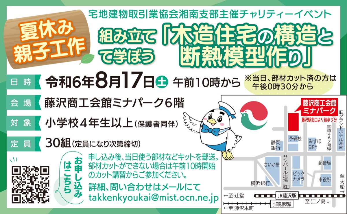 (公社)神奈川県宅地建物取引業協会湘南支部(水落雄一支部長)では親子で楽しめる工作チャリティーイベントを8月17日(土)、藤沢商工会館6階で開催する。午前10時から(部材カット済の人は午後0時30分から)。参加無料。