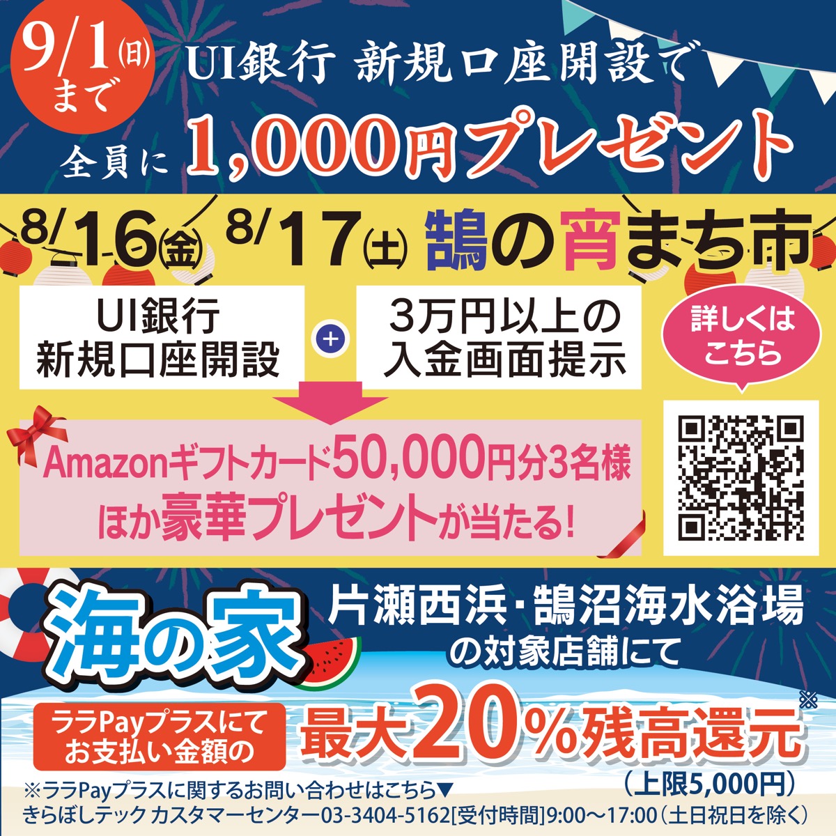 キャンペーンに合わせて、8月16日(金)・17日(土)に鵠沼海岸商店街で行われる「鵠の宵まち市」にUI銀行のブースが登場。口座開設・入金でアマゾンギフトカードなどが当たる抽選に参加できる。商店街加盟店舗による出店やイベントを楽しみながら、高金利と手数料優遇サービスを展開するUI銀行の口座開設を検討してみては。