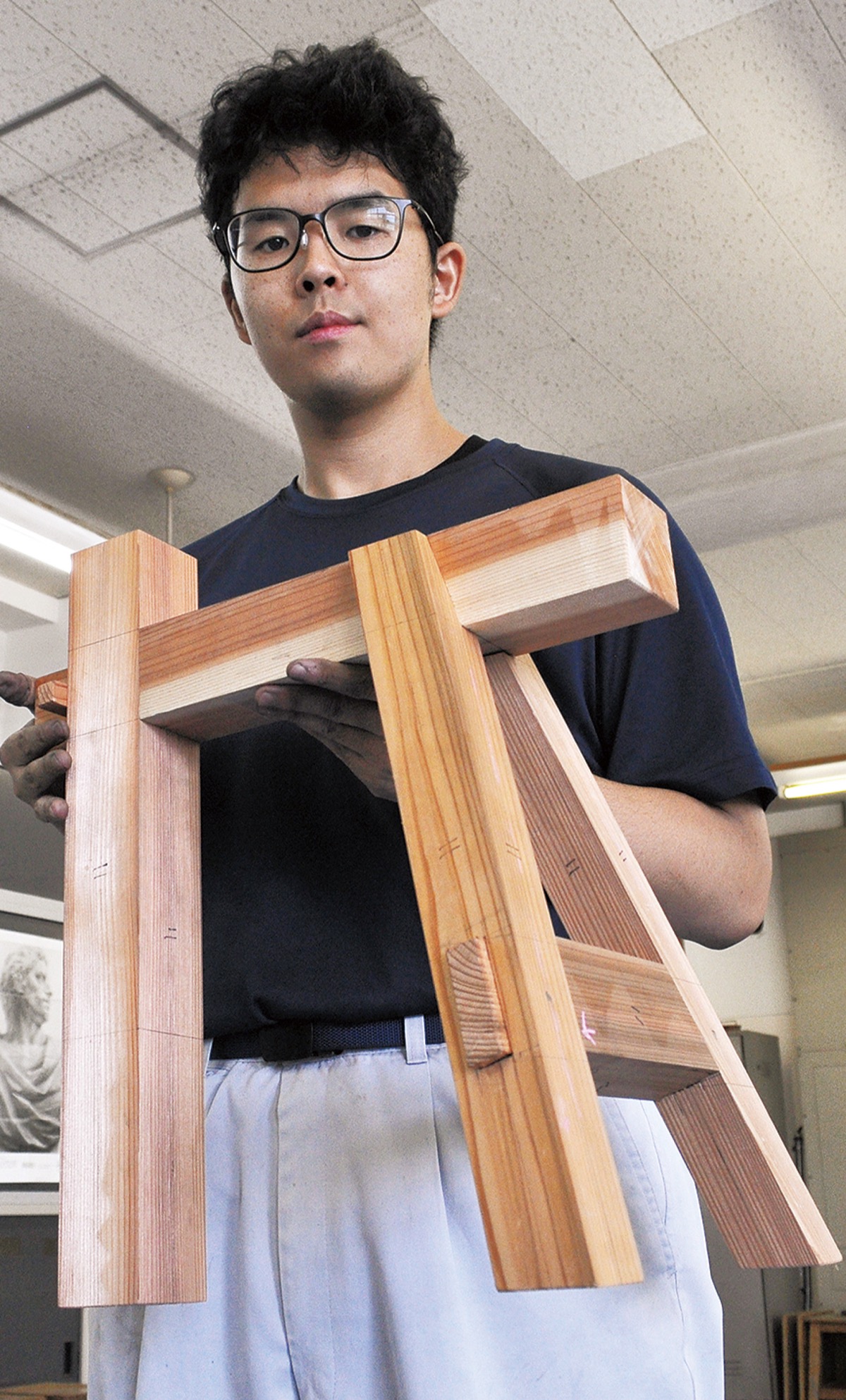 中学校の授業で本棚を制作した際に「頭の中にあるイメージが形になっていくのが楽しい」と、ものづくりの魅力にのめり込んだ神谷さん。高校入学後は建築研究部に所属し、現在は部長を務めている。大会を前に夏休みもほぼ毎日学校に通って腕を磨き、「将来大工になりたい」と目を輝かせる。大会は、将来の目標への第一歩。部員たちを指導する大西堅司総括教諭は「コツコツやる子。少しずつ成果も出ている」とそっと見守る。
