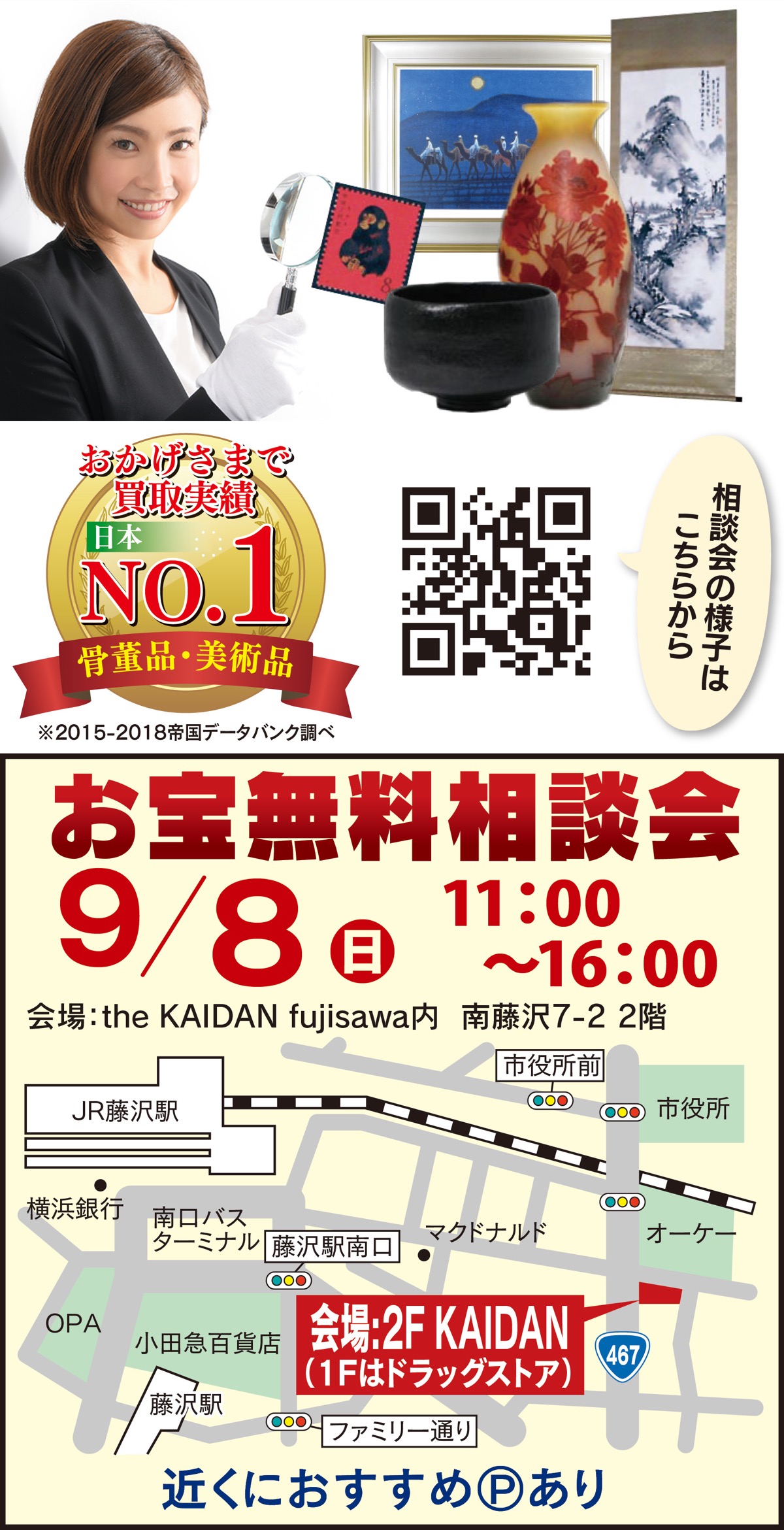 本郷美術骨董館・湘南藤沢支店は9月8日(日)、「お宝無料相談会」を開催する。同店は東大赤門前で創業40年になる美術品や骨董品の専門店。経験豊富な各分野の鑑定士が27人も在籍し、様々な提案を行う。現代アート、絵画、茶道具、古美術品等あらゆるジャンルに対応できるのも魅力。TVや新聞、雑誌にも数多くとりあげられている。特に中国美術の買取りを強化中。「日程の合わない方は、出張査定も大歓迎です」と乾店長は話す。