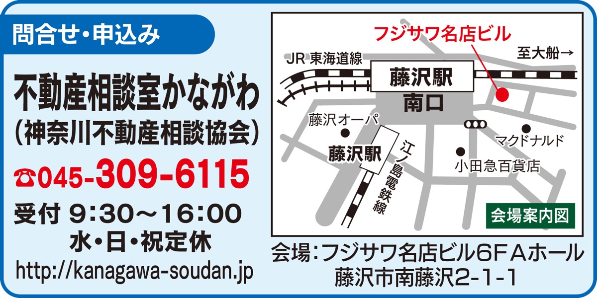 「不動産相談室かながわ」が毎月各地で開催中の相続と不動産に関する無料相談会。10月19日(土)に、JR・小田急線藤沢駅南口すぐの「フジサワ名店ビル」6階Aホールで開かれる。