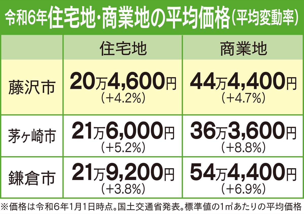 藤沢市では59地点中57地点が上昇。1平方メートル当たりの平均価格は20万4600円(価格変動率4・2%増)。また商業地では17地点全てが上昇し、44万4400円(2万2200円増)。いずれも下落した地点はなく、市内外からの土地需要の高さが鮮明となった。
