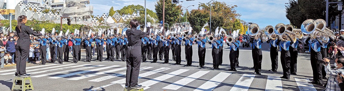 駅西口、東口の道路を使って繰り広げられる名物のパレードは今年も健在。27日、セレモニーの後、11時40分からスタートし、名門として全国に名を轟かせる湘南台高校吹奏楽部の「WhiteShooting Stars」をはじめ、地元の様々な団体や、世界最高峰の軍楽隊として知られる米国海軍第七艦隊音楽隊らおよそ13組が華やかな演技で練り歩く。
