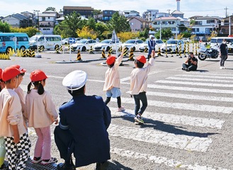教室には、隊員扮する亀のキャラクター「もしもくん」が登場。「おうちの人と手をつなぐ」「飛び出さない」といった注意点を園児と約束した。後半では、園児が教わった渡り方を実践。手を高く挙げ、左右を確認しながら横断した。同園の古郡健副園長は「園児たちが自分の命を守るためにルールを守ってくれたら」と期待を込めた。