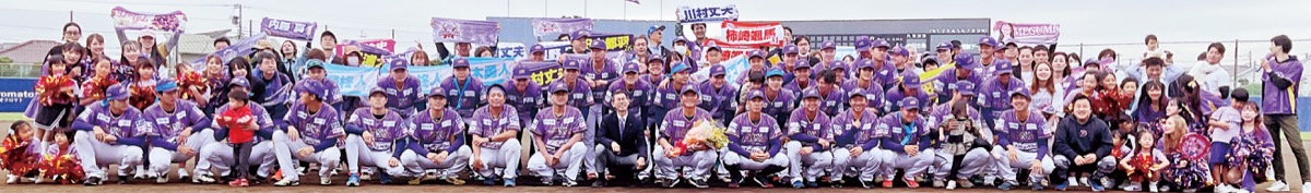 今季リーグ優勝を決めたプロ野球独立リーグ・ルートインBCリーグの「神奈川フューチャードリームス」(神奈川FD)川村丈夫監督=写真中央=の退任式が先月26日、八部球場で開かれたファン感謝デーで行われた。