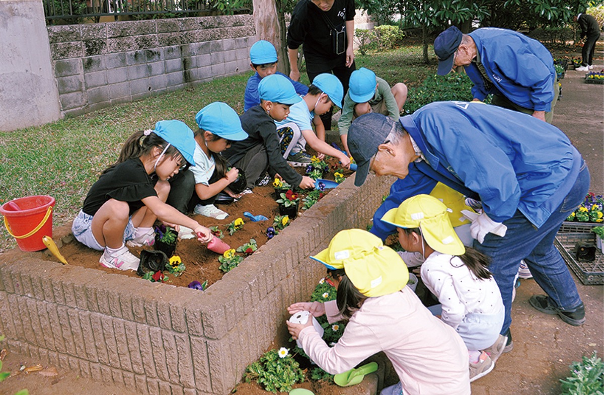 公園の清掃や除草、花壇の手入れなどをボランティアで行っている藤ヶ谷公園愛護会が10月22日、同公園で花苗の植え付けをした。近隣にある鵠沼めぐみルーテル幼稚園と保育園のキディ鵠沼・藤沢の年長園児合わせて40人も参加。赤や黄色、紫色のパンジーやスミレ、ノースポールなど色とりどりの花およそ380株を花壇に植えた。