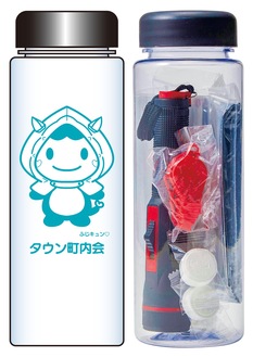 タウンニュース社では災害に役立つアイテムがセットになった「防災ボトル」に、藤沢市公式マスコットキャラクター「ふじキュン♡」のイラストと団体名などを印刷するオリジナル商品の取り扱いを始めた。