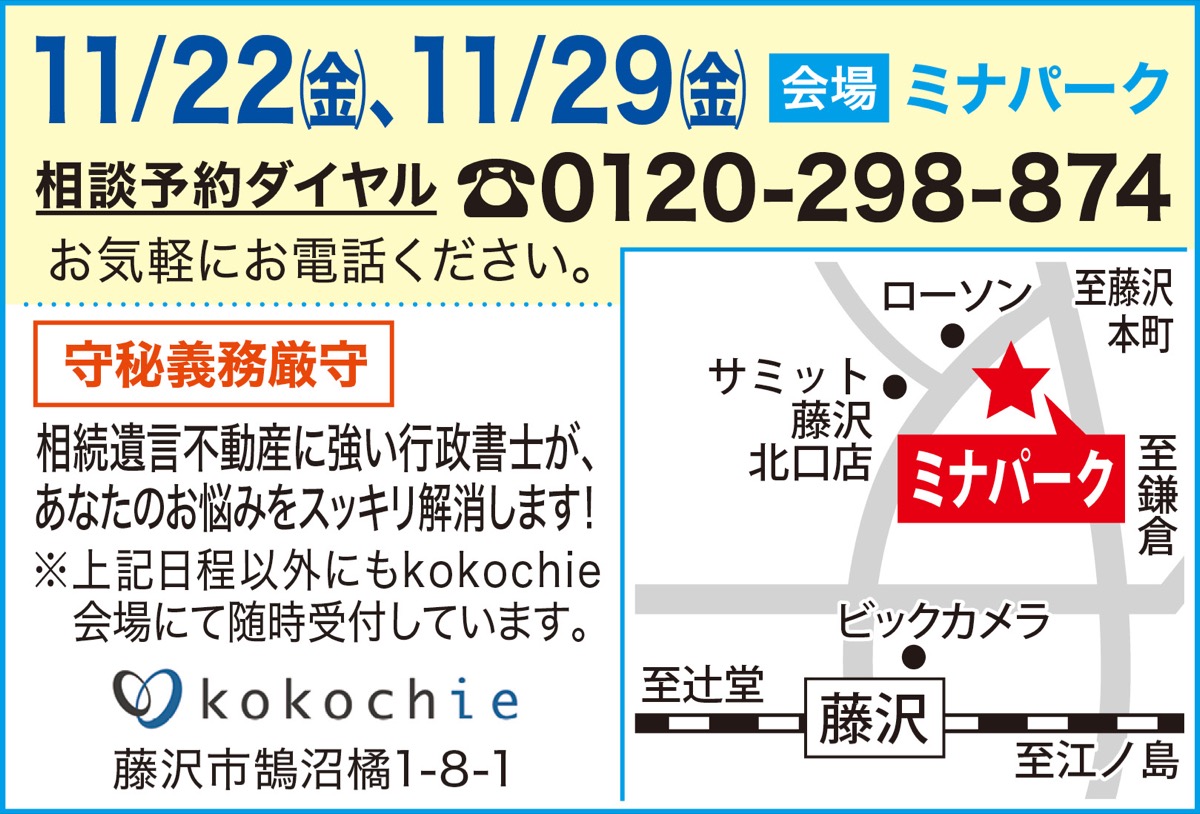 市内の相続・遺言に強い行政書士が11月22日(金)・29日(金)に藤沢商工会議所ミナパーク5階(左地図参照)で「相続・遺言・不動産のお悩み相談会」を開催。参加無料。