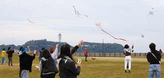 ガザ地区の子どもたちが東日本大震災の復興を願ってたこ揚げが行われるなど、両地域の連帯と平和を意味するたこ揚げ。この日は子どもから大人まで約50人が参加。手作りのたこにガザへのメッセージやイラストなどを描き、一斉に空へ揚げた。