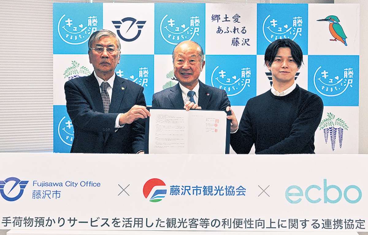 観光客の利便性向上を図ろうと、藤沢市と(公社)藤沢市観光協会、ecbo(株)(東京都渋谷区)は来月中旬から、同社が運営する荷物預かりサービス「ecbo cloak」の実証実験を市内で開始する。25日、3者は連携協定を締結。登録店舗の空きスペースを活用し、1日1個500円から荷物を預かることで、「手ぶら観光」の促進につなげる狙い。