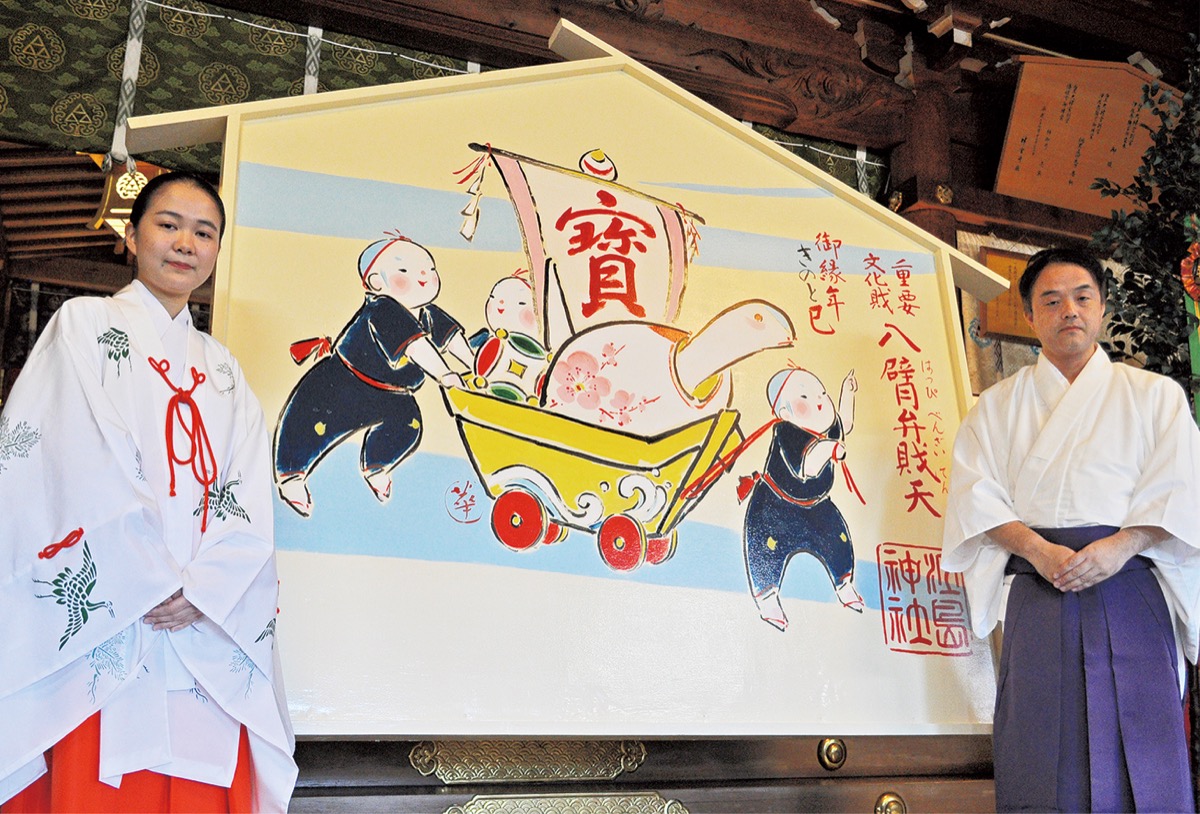 絵馬の大きさは高さ2・5m、横幅2・6m。同神社の美術顧問を務める日本画家の片岡華陽さんが手掛けた。3人の子どもが張り子のヘビなどを宝船を模した引き車に積んで歩く様子が、丸みのあるタッチで描かれている。