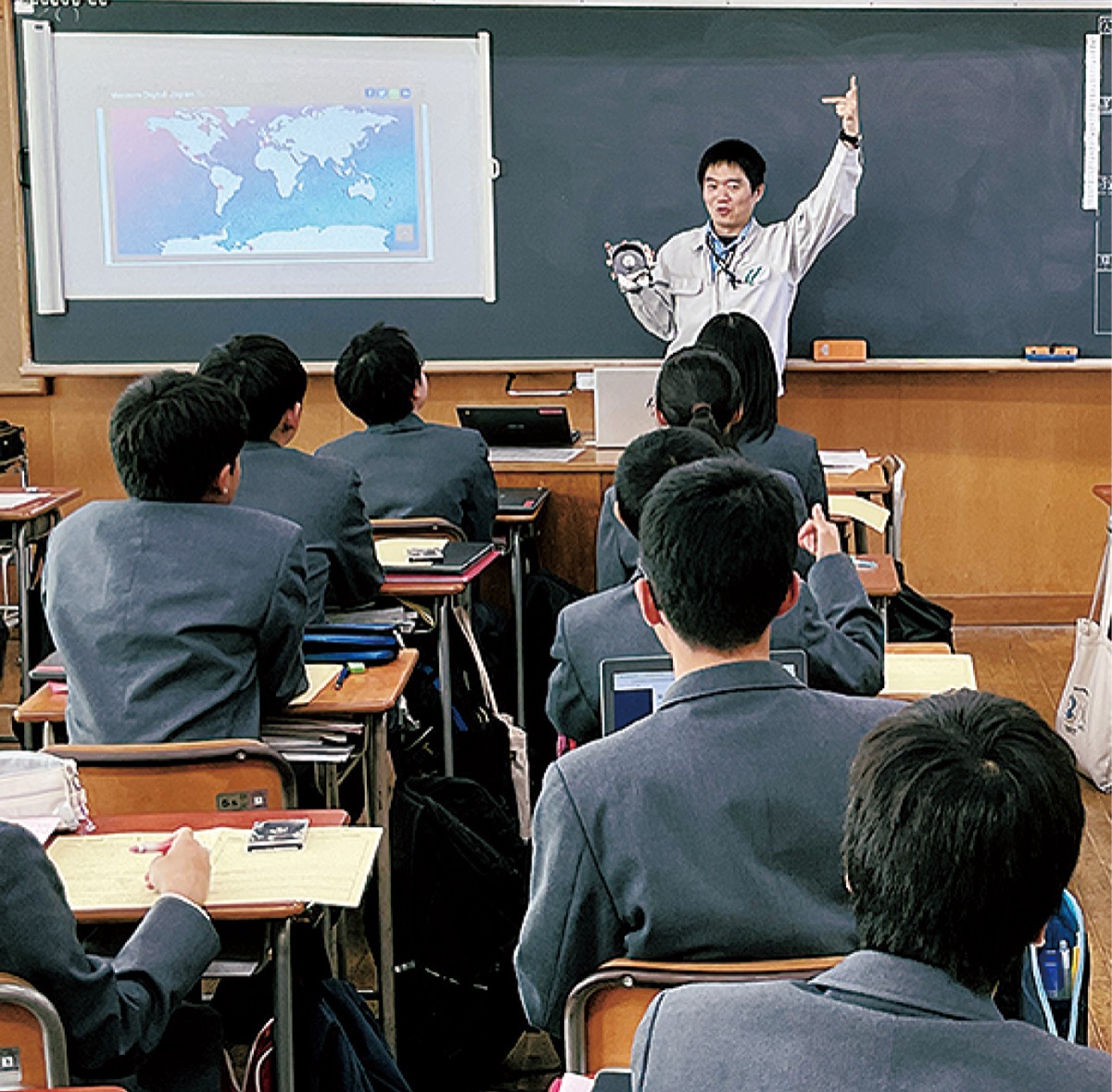 生徒たちは10グループに分かれ、ハードディスクドライブ(HDD)開発・製造のウエスタンデジタルテクノロジーズ合同会社(桐原町)のエンジニアによる講話では、同社の製品が2019年に世界初のブラックホール撮影に使用されたことなどを聞いた。「AIの進歩はHDDにどのような影響を与えましたか」「なぜこの仕事に就いたのですか」などと質問を寄せた。