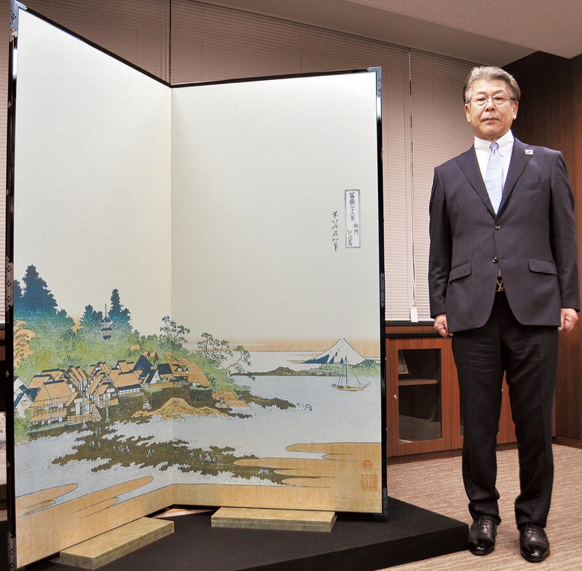 寄贈品は、台所へと向かう通路などを隔てる際に用いられる「大勝手屏風」。藤沢にちなみ、表には葛飾北斎の『冨嶽三十六景・相州江の島』のデジタルプリントが施されている。また、屏風と共に寄贈された台座は、丸山さんの店で出た古いふすまの枠を再利用して作られたものだという。