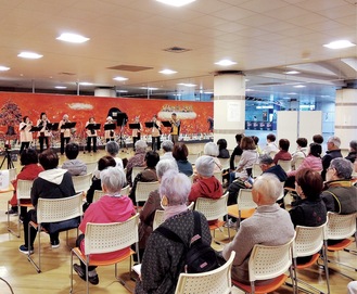 湘南台の今田団地自治会のシニアが集う今田しらさぎクラブは先月24日、湘南台駅地下アートスクエアで手作り音楽会=写真=を開いた。