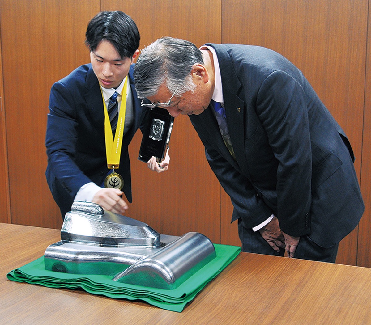 「第62回技能五輪全国大会」が先月22日から25日まで愛知県で開かれ、いすゞ自動車(株)藤沢工場が運営する訓練校、いすゞ自動車高等工業学校所属の川那子大輝さん(22歳・菖蒲沢在住)が「自動車板金」競技で厚生労働大臣賞にあたる優勝を果たした。市内企業の出場選手としては史上初の快挙。今月10日には川那子さんらが市役所を訪れ、鈴木恒夫市長に大会結果を報告した。