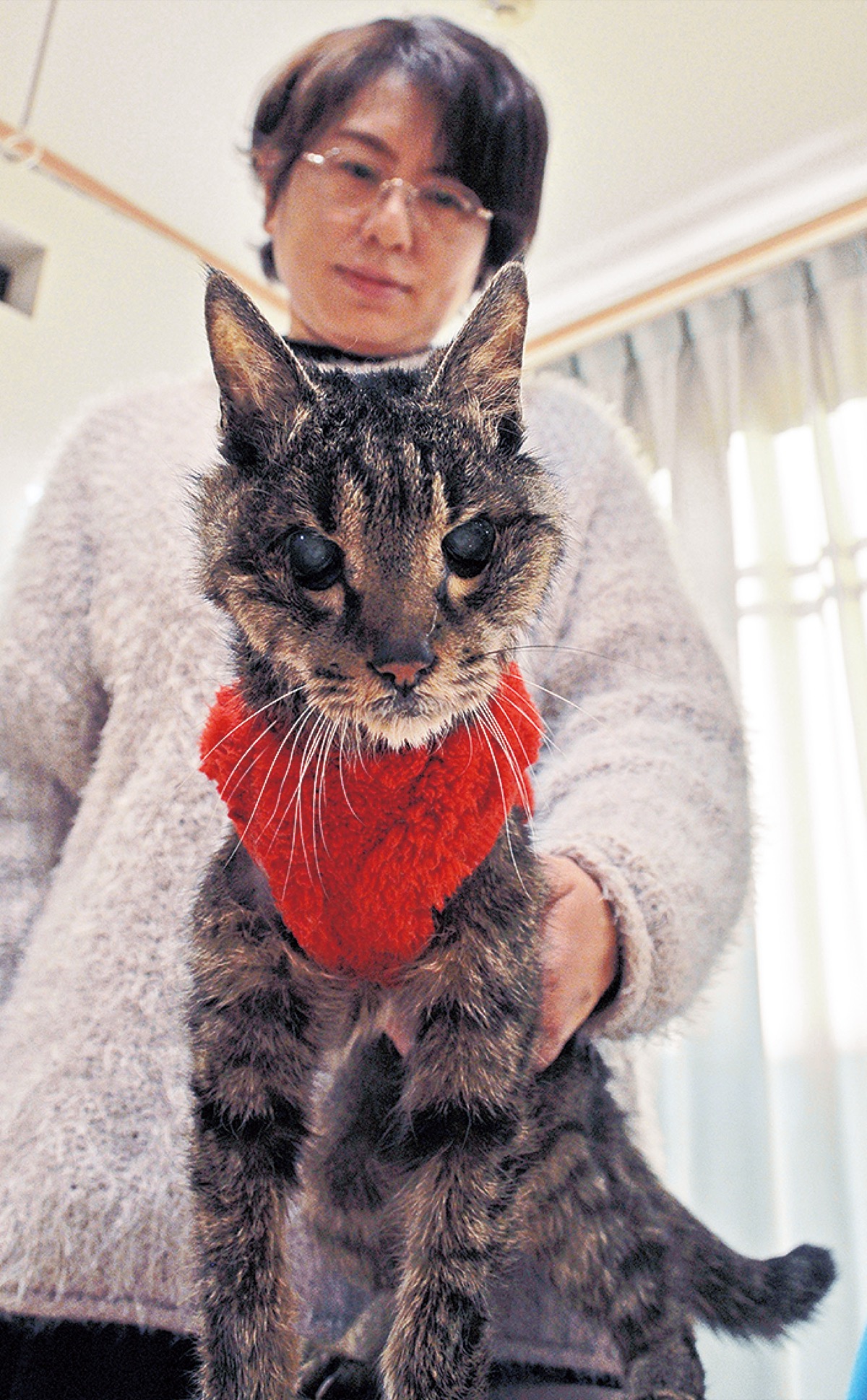 「ニャー(ご飯ほしい)」。つぶらな瞳で真記さんをじっと見つめる夏生。食欲はある。まだ長生きしそうだ。