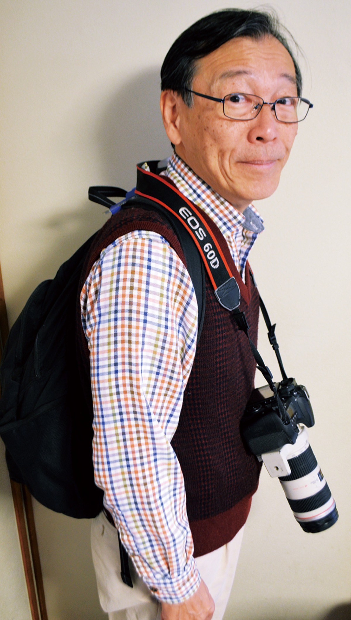 定年前は自動車などの開発に携わっていたこともある河口さんは、写真撮影と発明が趣味。グッズ開発のきっかけは「首が痛いと撮影に集中できないから」と話す。