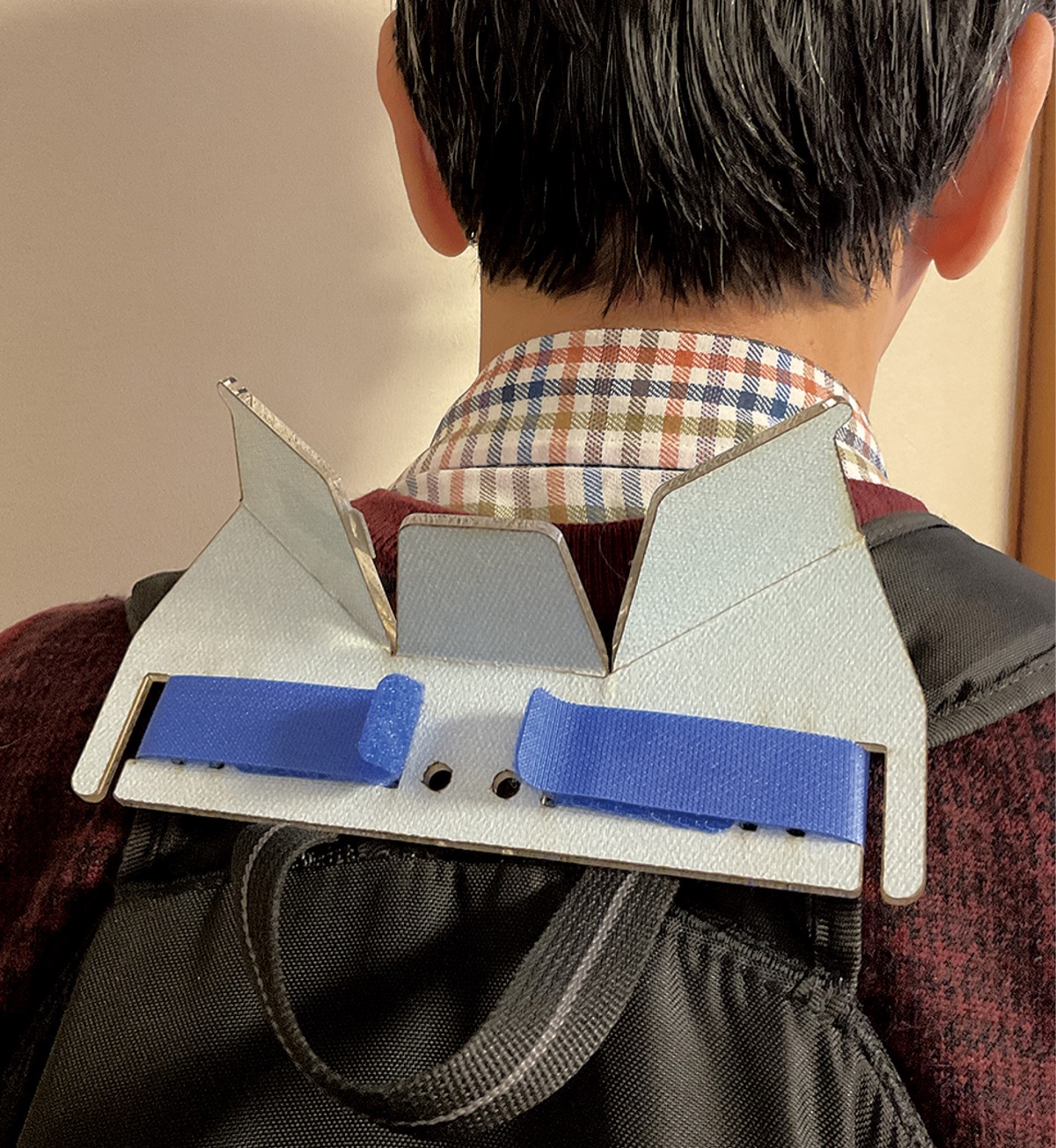 開発作品の名は「ストラップ保持用フック」。アクリル板とマジックテープのシンプルな作りながら、リュックに取り付け、カメラストラップをそこにかけると、首の負担を軽減してくれる。
