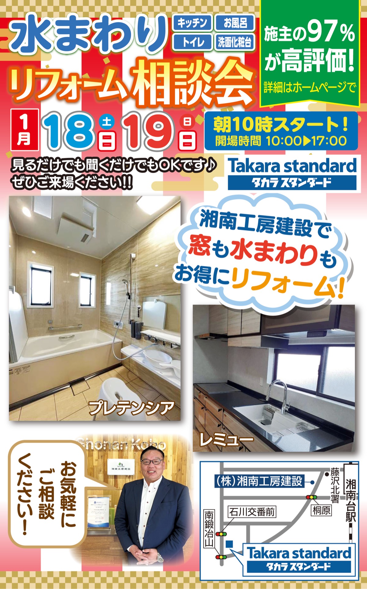 そんな人におすすめなのが、1月18日(土)と19日(日)に湘南台のタカラスタンダード藤沢ショールームで開催されるリフォーム相談会だ。会場は地元密着の(株)湘南工房建設が対応。最新かつ高性能なキッチン・浴室の実例を見て、触れながら、施工のプロに住まいの悩みを何でも相談できる。